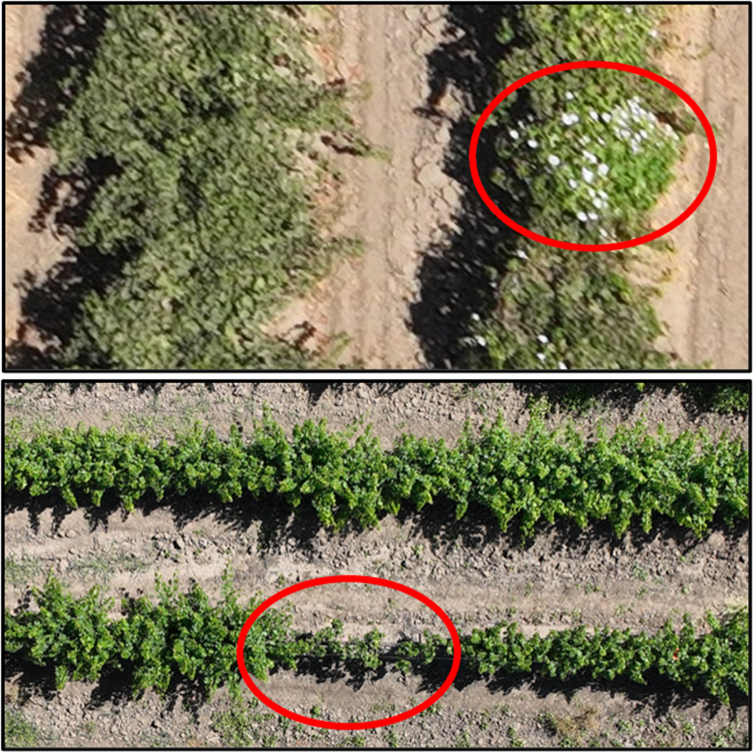 High-resolution drone imagery allows early detection of field problems. Even a standard RGB camera can identify weed patches, water pooling, or irrigation leaks, details that help pinpoint where action is needed (Figure 1). Drones help farmers take targeted steps before minor issues spread, saving time, labor, and inputs by focusing efforts only where they’re needed. Many growers find that early detection improves yield, crop quality, and overall management decisions.