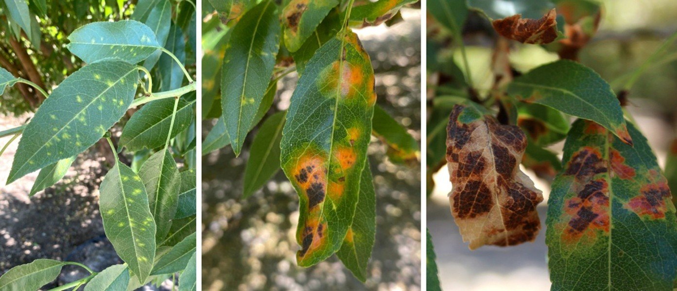 RLB affects almond leaves, causing leaf spots of different sizes and shapes. These leaf blotches are initially yellowish in color, turning orange to reddish-brown as the growing season progresses. The first symptoms can be noticeable in mid to late April, approximately five to six weeks after the initial leaf infections. New symptoms can appear through June on the leaves of actively growing shoots. At advanced stages of disease development, in June and July, leaves become necrotic, curl, and drop prematurely. RLB is caused by P. amygdalinum, an obligate biotrophic fungal pathogen, which is dependent on living plant tissue for growth, reproduction, and feeding and cannot be grown on culture medium. To facilitate diagnosis of RLB and identification of its causal agent, we tested and validated a polymerase chain reaction (PCR) assay (Zúñiga et al. 2018) that uses species-specific primers following DNA extraction directly from leaves. Using similar tools, P. amygdalinum was formally confirmed in 2024 as being present in the state by both CDFA and the USDA.
